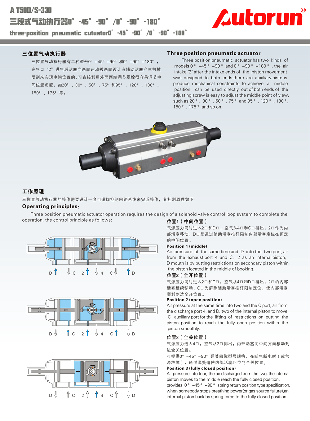 三段式氣動執(zhí)行器常規(guī)有:0°~45°~90°和 0°~90°~180°,在氣口2,進氣后,活塞向兩端運動被兩端輔助活塞產(chǎn)生機械限位,實現(xiàn)中間位置??梢岳脙啥苏{(diào)節(jié),如20°、30°、50°、75°和95°、120°、130°、150°、175°等 。三段式氣動執(zhí)行器主要用于定量裝車,定量罐裝系統(tǒng)中,對控制的閥門實現(xiàn)分程控制。