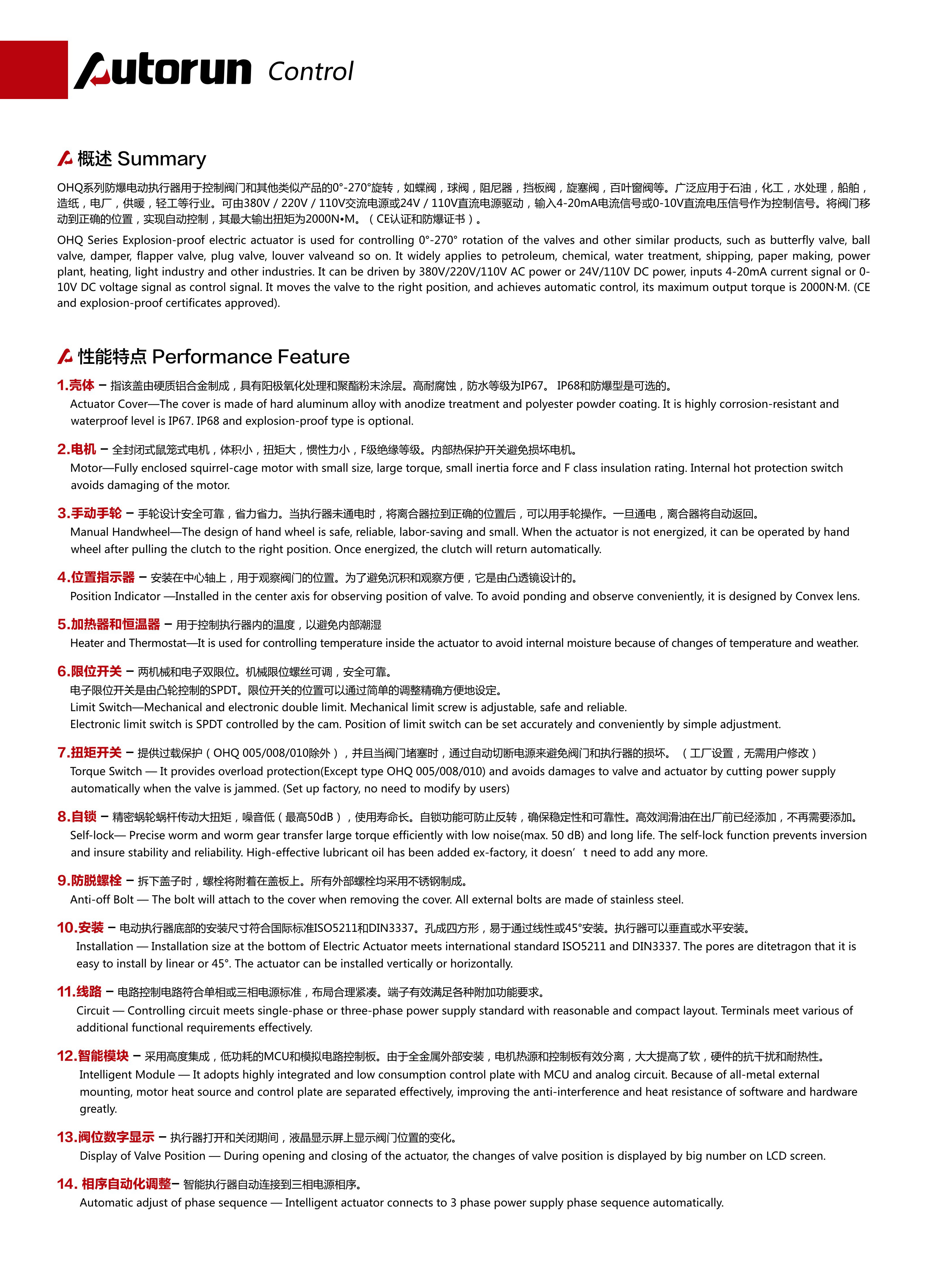AUTORUN OHQ series explosion-proof electric actuators have obtained ExdIICT5GB explosion-proof certification. Switch type, adjustable type and intelligent type are available. Intelligent type has control panel and LCD screen, which is convenient for field control.